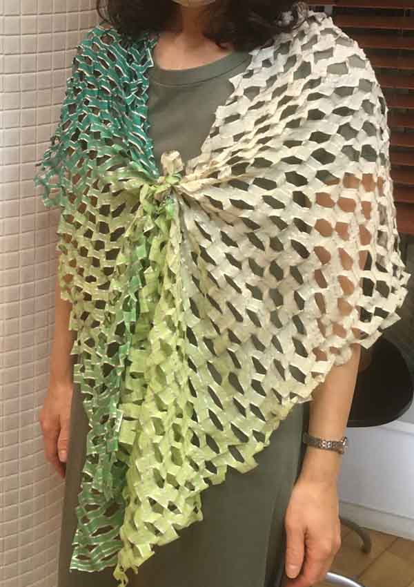 The seamless hemlines with a natural finish delineate gentle waves, and the added glory of lamé glisters like delicate fragments of the light tremoring with ripples of the waves. When it is softly tied up and hung down, it gives an impression of a limpid waterfall. Hand dyed with a beautiful color gradation on fine cotton, and cutwork of waves shape framed with metallic.