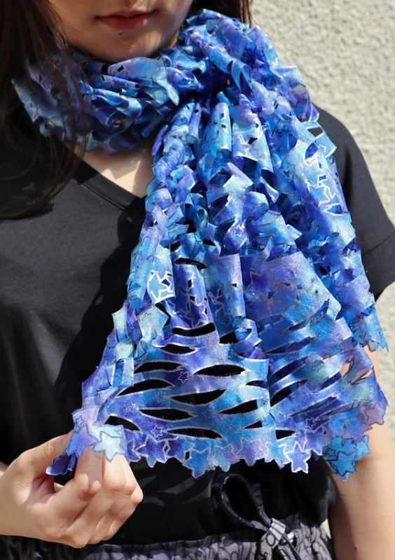 羽の様に軽やかなシルク羽二重に、宇宙の様なブルーの模様と色合をプリントしました。