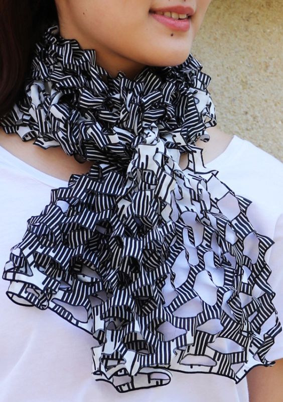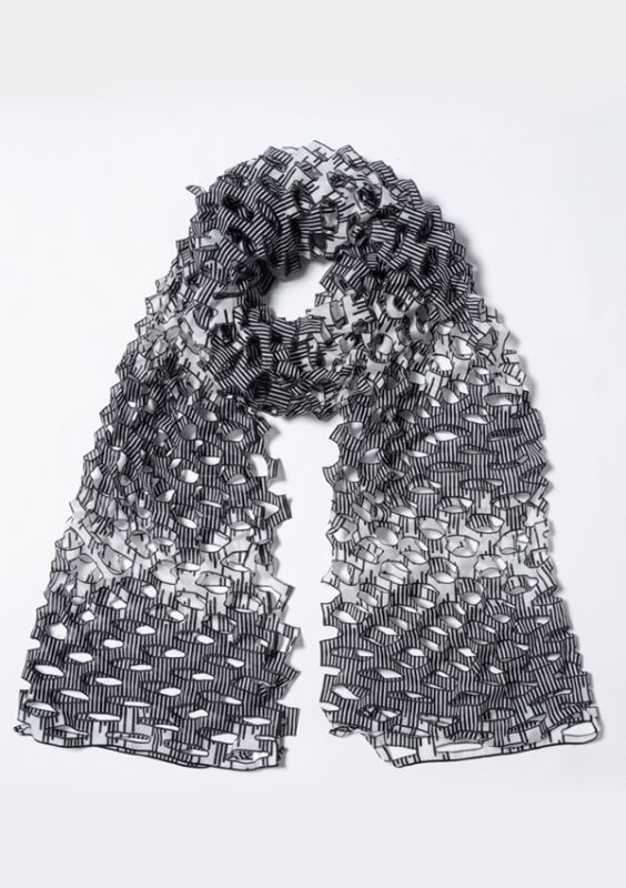 Inspired by Japanese Star Festival ornaments, which are created by folding and cutting Origami paper. When opened, the scarf's pattern has the appearance of a net.