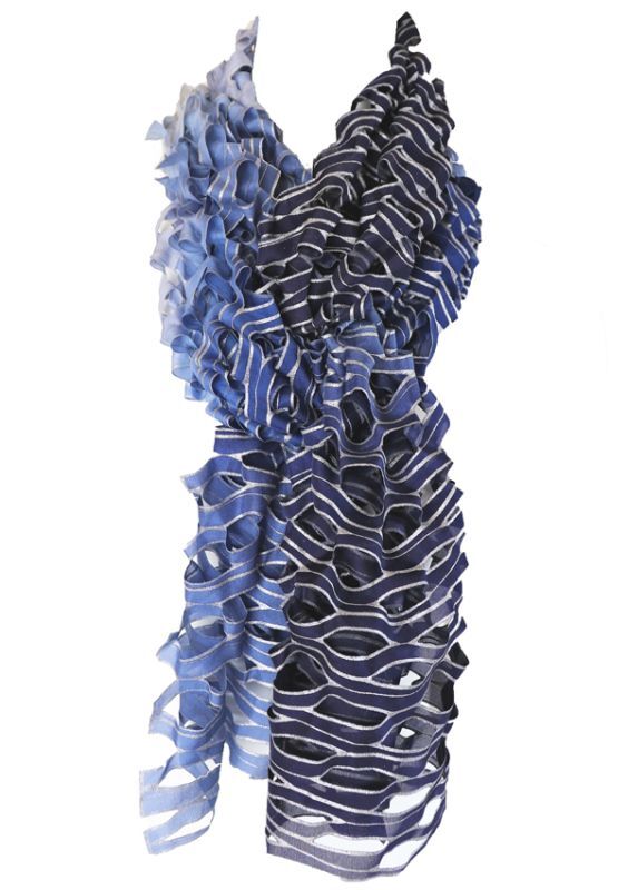 The seamless hemlines with a natural finish delineate gentle waves, and the added glory of lamé glisters like delicate fragments of the light tremoring with ripples of the waves. When it is softly tied up and hung down, it gives an impression of a limpid waterfall. Hand dyed with a beautiful color gradation on silk habotai, and cutwork of waves shape framed with metallic.