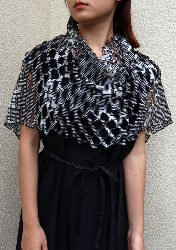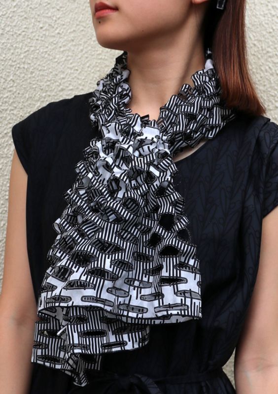 Inspired by Japanese Star Festival ornaments, which are created by folding and cutting Origami paper. When opened, the scarf's pattern has the appearance of a net.