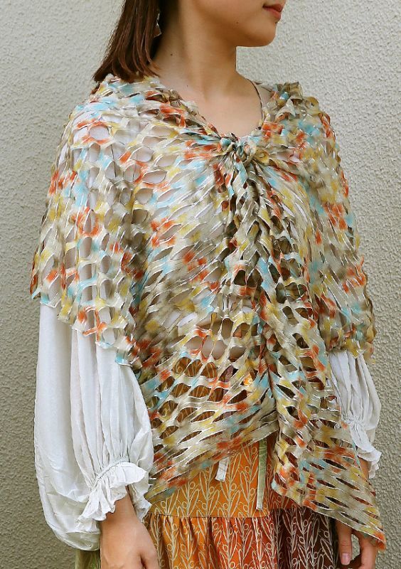 首にキュッと巻くと保温性もあり、ケープの様に羽織ると涼しげで、 ドレスアップも可能です。
