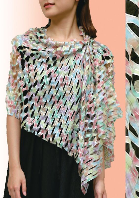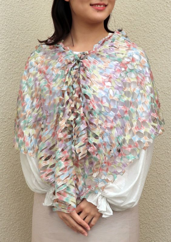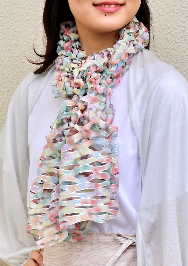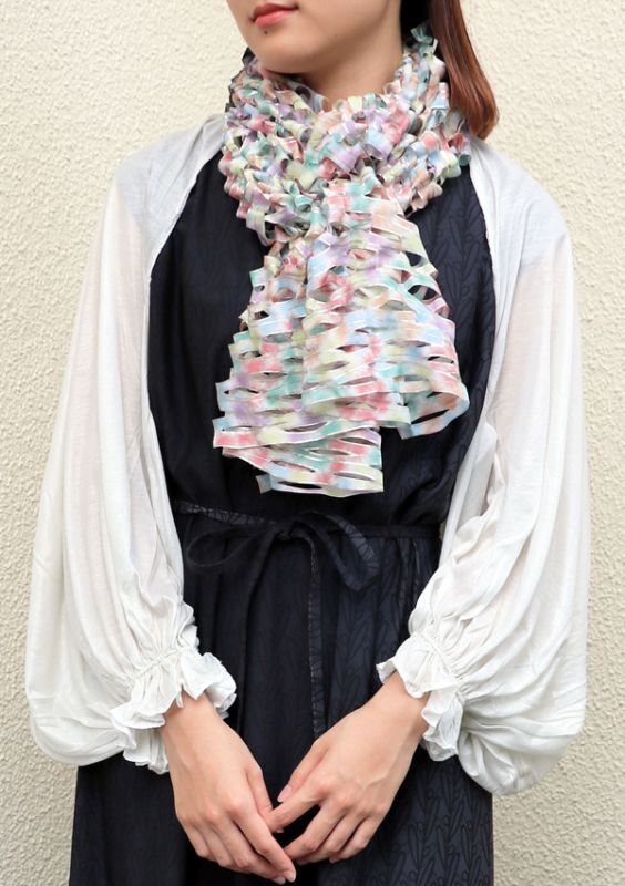 首にキュッと巻くと保温性もあり、ケープの様に羽織ると涼しげで、 ドレスアップも可能です。