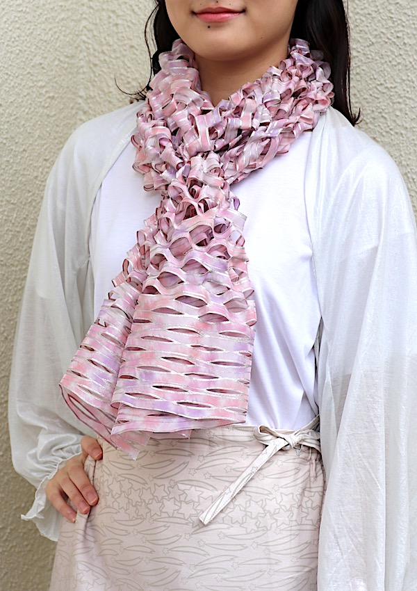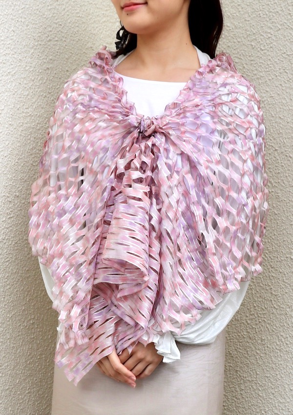 首にキュッと巻くと保温性もあり、ケープの様に羽織ると涼しげで、 ドレスアップも可能です。
