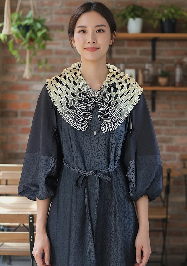 裾周りには、ゆるやかなカーブを描くカットワークのフリンジがあしらわれ、どこか素朴でありながらも、